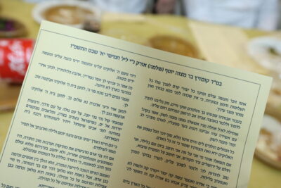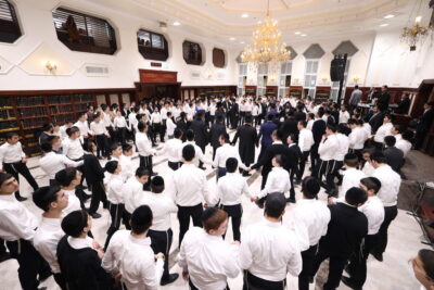 תחילה התקיימה תפילת ערבית מרוממת עם בני הישיבה כשחתן הבר מצוה יוסף ניגש לפני העמוד לראשונה, כשאחד מבני הישיבה עומד לצידו להרגילו בנוסח של הישיבה. לאחר מכן נערכו ריקודי שמחה בבית המדרש עם תזמורתו המורחבת של המאסטרו בני לאופר ובעל המנגן שרוליק קלצקין, כאשר תוך כדי ערכו מבני הישיבה ריקוד קוזקים מיוחד לכבוד חתן הבר מצוה.