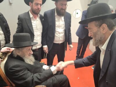 לאחר סבב אירועים בעיר: ח"כ גפני נראה מתברך בהכנעה רבה כאחד התלמידים ממש, מראש הישיבה הגר"ד לנדו, לאחר הכנס הענק של ישיבת מיר בהיכל הארנה