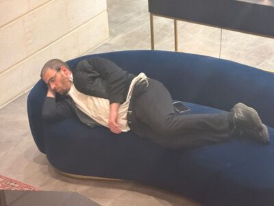 בסיום ימי השובבי"ם העמוסים לעייפה, ולאחר עשרות שעות לימוד ברציפות, "קרס" באחד מימי השבוע העיתונאי איצו פלדמן על ספת אחת המלונות בעיר