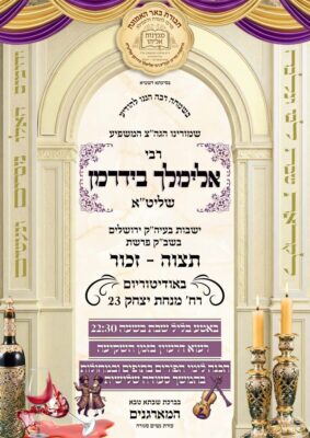 הגה"צ המשפיע רבי אלימלך בידרמן ישבות בעיר לכבוד שבת זכור, התפילות, באטע, ושלש סעודות יתקיימו באודיטוריום ברחוב מנחת יצחק.