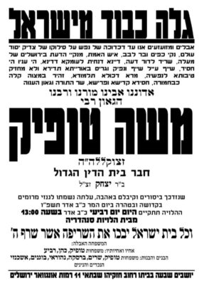 אבל כבד בעולם התורה והדיינות: ברחבי העיר מתקבלת בהלם ובצער רב הידיעה על הסתלקותו של הגאון הגדול רבי משה טופיק זצוק"ל חבר בית הדין הגדול לעירורים (לשעבר), ואחיהם של הגאונים מרן הגאון הגדול רבי אליהו טופיק שליט"א ראש ישיבות 'באר יהודה' והגאון הגדול רבי אברהם טופיק שליט"א מראשי ישיבת פורת יוסף.
