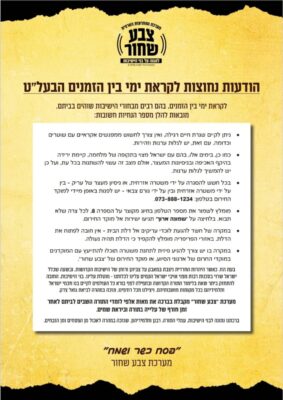 גם במערכת "צבע שחור" יצאו עם הנחיות זהירות לבני הישיבות: מערכת "צבע שחור", הפועלת בהכוונת גדולי התורה וראשי הישיבות, פרסמה אף היא הנחיות לקראת ימי בין הזמנים, תוך קריאה להורים ולמחנכים להגביר את האחריות בתקופה זו.