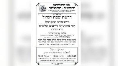 האדמו"ר מדושינסקיא ימסור את דרשת שבת הגדול לפני קריאת התורה בשבת בבוקר בבית המדרש הגדול מהרי"ץ דושינסקיא ברחוב שמואל הנביא.