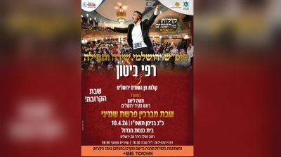 האירוע ייתקיים בהשתתפות האמנים רפי ביטון & קולות מן השמים – ירושלים. זמני תפילות: ליל שבת 18:30, שחרית ומוסף 08:00