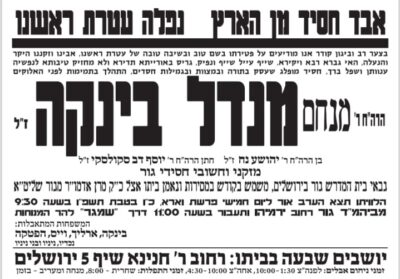 הלווייתו תצא הערב בשעה 21:30 מבית המדרש הגדול של גור ברחוב ירמיהו, ותעבור בבית ההלוויות שמגר בדרכה להר המנוחות שם ייטמן