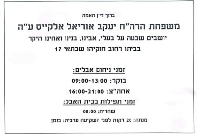 המנוח הותיר אחריו משפחה כואבת, את רעייתו שתחי' ושבעה יתומים רכים בהם בן הלומד בישיבת חברון בגבעת מרדכי. עם צאת השבת הגיעו עובדים סוציאליים וגורמי מקצוע לישיבה, על מנת לבשר לבחור על פטירת אביו ברגישות הנדרשת.