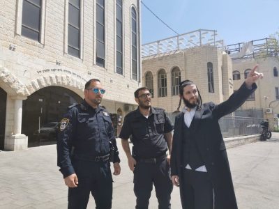פנחס קוביץ מהרשות החרדית יחד עם רחמים אבן מפקד המשטרה בבר אילן ואחראי מטעם השיטור העירוני בסיור לקראת ההדלקה המרכזית של 'רחמסטריווקא' בסמוך למרכז החסידות בעיר
