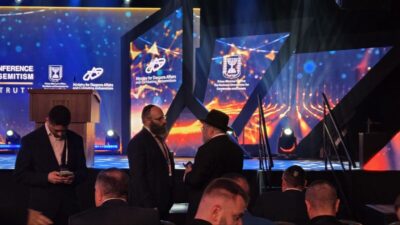 הרב מנחם מענדל מרגולין יו"ר איגוד הארגונים היהודיים באירופה (EJA) ויו"ר מרכז רבני אירופה (RCE). עם הרב יהורם אולמן מאוסטרליה שחתנו נהרג בפיגוע בכנס האנטישמיות בבנייני האומה