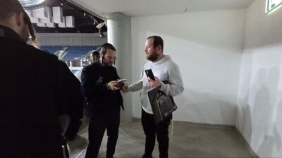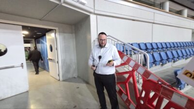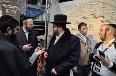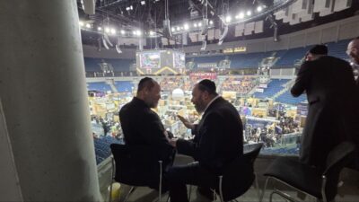 אריה ארליך בלוק תורני משהו. ברקע: יוסי שטארק באקספו