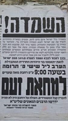 הערב (ליל שישי) צפויה להתקיים מחאת זעם של גורמים קיצוניים בציבור, זאת על רקע קידום חוק הגיוס והדיונים הציבוריים שעדיין נמשכים כך העת סביב סוגיית גיוס בני הישיבות.
