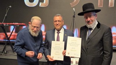 הרב הראשי לשעבר הרב דוד לאו, רה"ע משה ליאון, ושורד השואה הירושלמי הרב צבי זלבסקי בהשקת ספר על זיכרונות השואה.